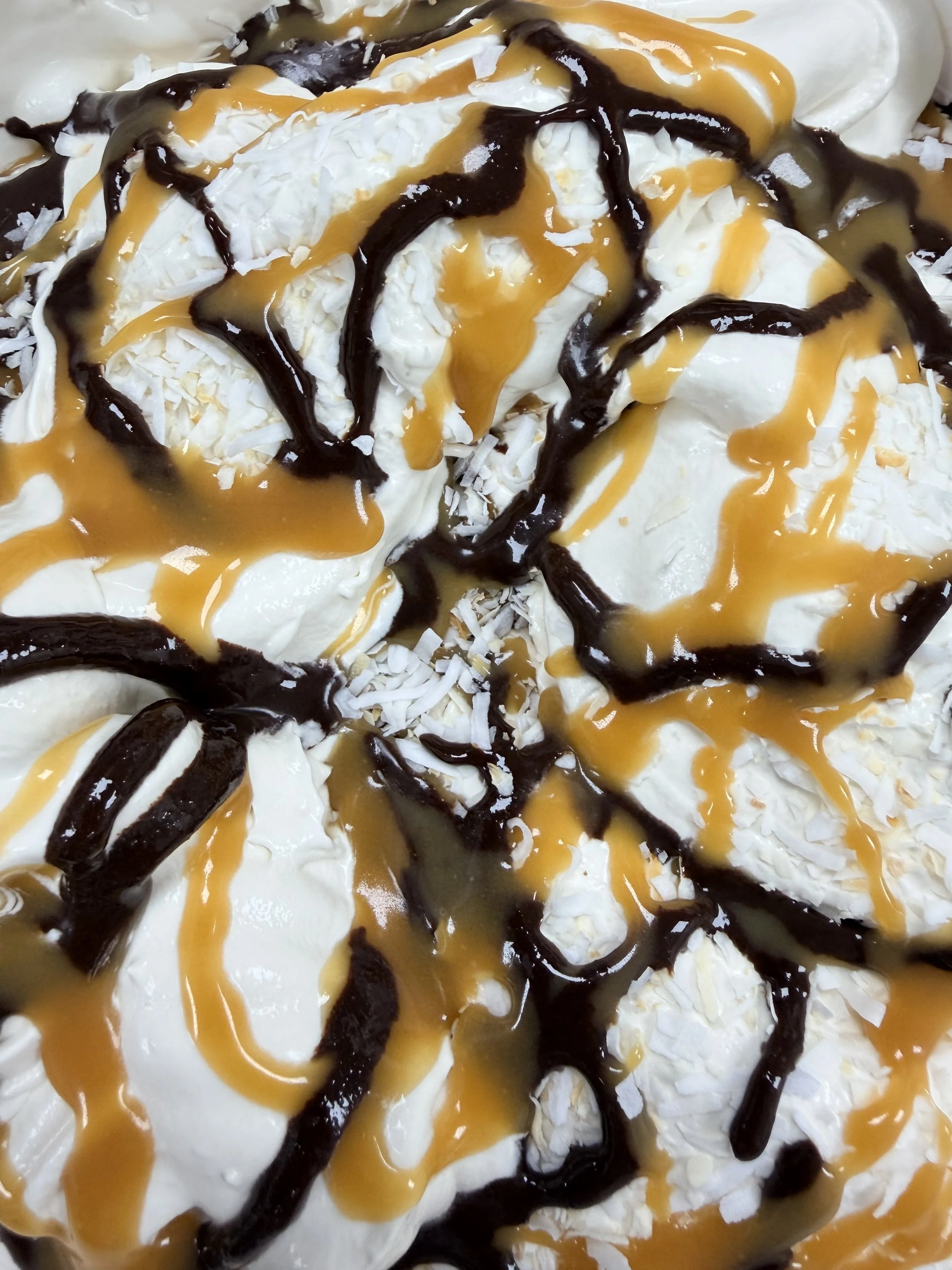 coconut base with toasted coconut flakes and swirls of dark chocolate and caramel